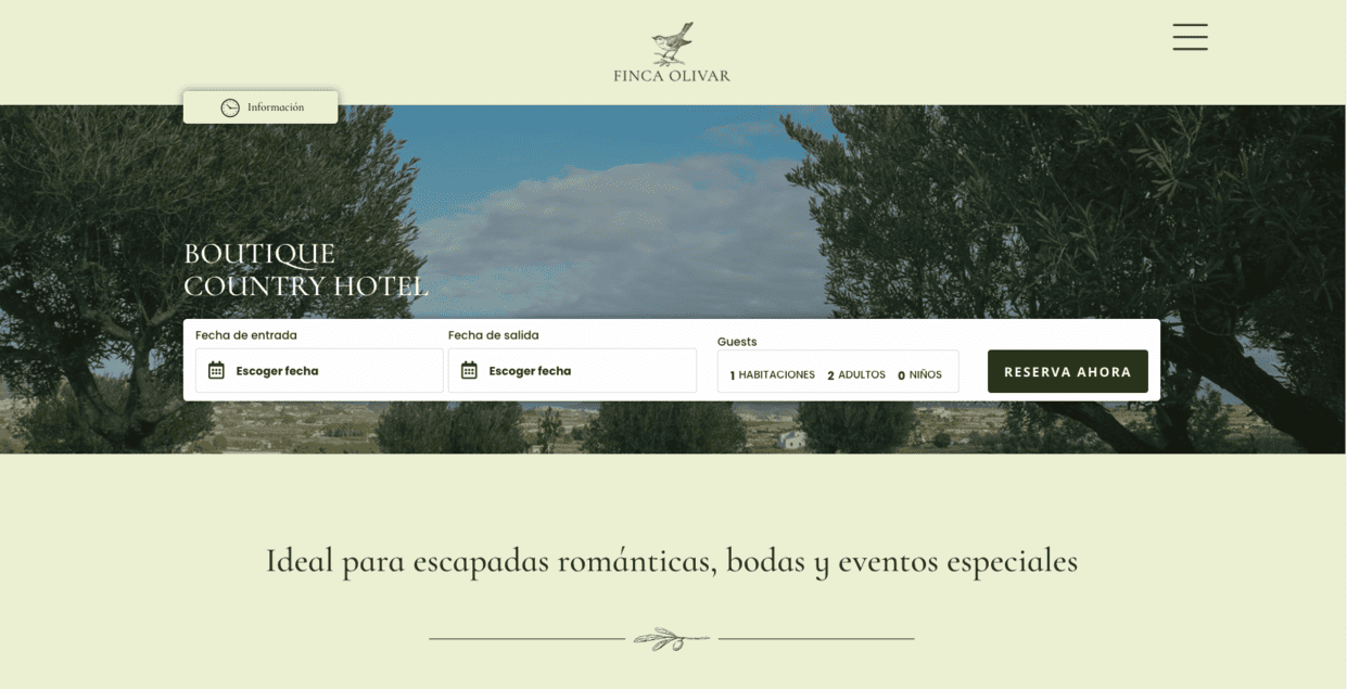 Pensado para escapadas románticas, bodas y eventos privados, Fincaolivar.es combina elegancia y cercanía en su comunicación, proyectando una imagen de exclusividad accesible. El diseño transmite la esencia del hotel: un espacio tranquilo y acogedor donde cada detalle está pensado para ofrecer experiencias memorables y un servicio personalizado que convierte cada estancia o celebración en un recuerdo único.