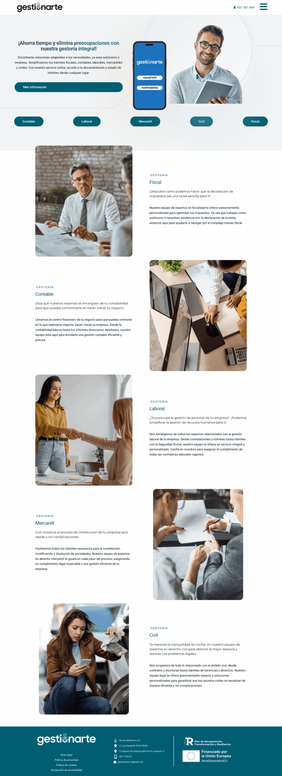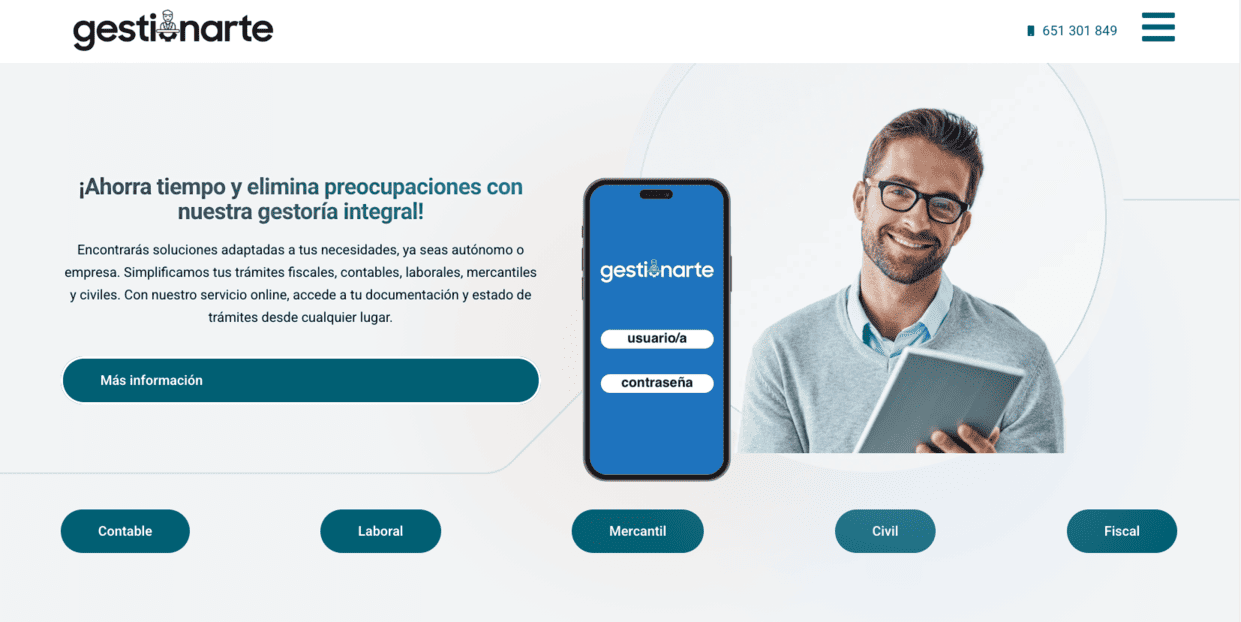 El estilo visual de Gestionarte.net combina frescura y seriedad, reforzando su imagen como una gestoría actual que entiende las necesidades reales de sus clientes. Gracias a su plataforma digital, los usuarios pueden consultar documentación, revisar el estado de sus trámites y mantener el control de sus gestiones en todo momento. Una web que une tecnología, cercanía y eficacia para ofrecer tranquilidad y ahorro de tiempo a quienes confían en sus servicios.